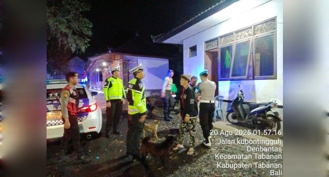 Tabanan | Polda Bali – Polres Tabanan – Humas Tabanan. Polres Tabanan kembali menggelar kegiatan Blue Light Patrol sebagai langkah preventif dalam menjaga situasi kamtibmas di wilayah hukumnya. Pada Rabu dini hari (20/8/2025), jajaran gabungan piket fungsi dipimpin Padal Polres Tabanan, IPDA I Gede Putu Krisnawan, melaksanakan patroli keliling antisipasi tindak kejahatan 3C (Curat, Curas, dan Curanmor). Kegiatan berlangsung mulai pukul 01.05 hingga 02.10 WITA dengan melibatkan 15 personel.