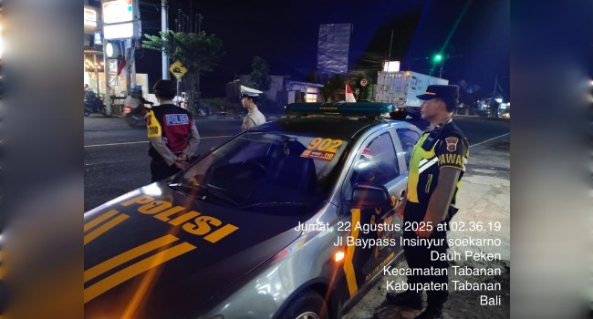 Tabanan | Polres Tabanan – Polsek Tabanan, Jumat 22 Agustus 2025. – Mencegah adanya gangguan Kamtibmas terutama pada malam hari Polsek Tabanan melalui piket malam gencar laksanakan Patroli malam pada Kamis malam, 21/8/ pukul 21.30 WITA.